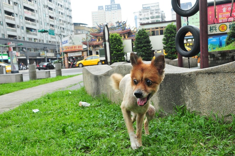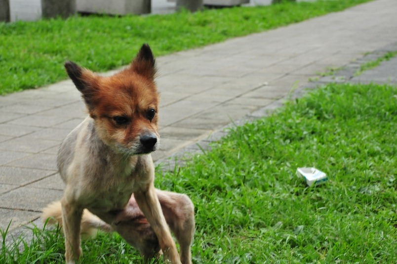 在萬華的小巷等紅燈準備轉到康定路上時,人行道上一隻患有嚴重皮膚病及殘障的無毛小小狗,很難不讓人注意,第一眼的感覺是「好可憐喔」!還這麼小如此懵懵懂懂的年紀就有這麼嚴重的病痛,任誰看了都不忍心。