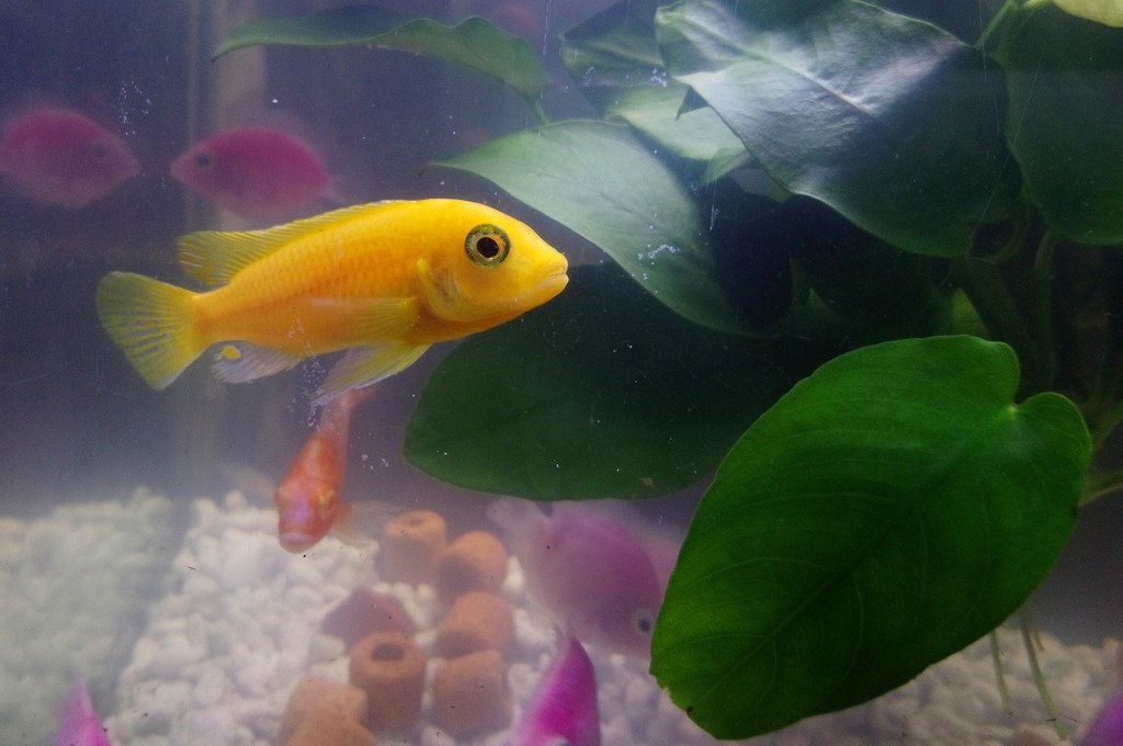 第一天大家相安無事,都還在適應環境,大多沉在水底不太活動。第二天,老大開始出現了,體型最大的金黃色非洲王子(約4公分),開始追逐桃太郎們(約2公分),除此之外也會追著紅眼皇冠(約3公分)和閃電戰神(約1.5公分)。而桃太郎們偶爾也會互相追逐。比較令人意外的是裡面體型最小的閃電戰神也很喜歡追著桃太郎跑。有隻紅眼皇冠總是待在水面附近,魚身也傾斜約20度,問店員後,是說正常現象應該是壓力比較大;總之小生態圈逐漸形成,希望大家都能平安無事。不過本來冀望桃太郎們能繁衍後代,可是現在總被非洲王子追著跑,感覺機會不太大。只能再慢慢觀察看看了。